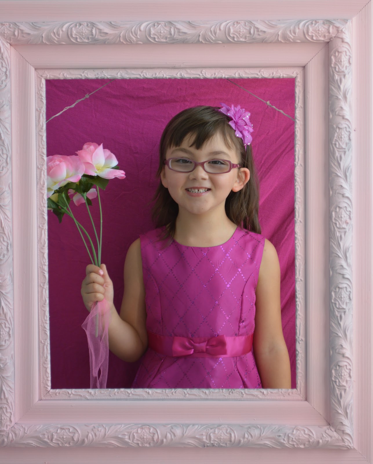 I add a simple pink sheet for the background on the wall, insert a chair for the gals to sit, and have a dress up box of PINK stuff for the girls to use if they wish. When my dear hubby takes the photos, he uses the frame as three borders, so I only had to crop the top out. We ended up putting a plastic storage box under the "frame" so the girls could stand instead of sit. (no pic of that, sorry)